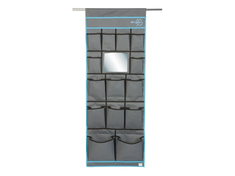 Een multifunctionele 14-vaks organizer met spiegel. Gemaakt van een hoge kwaliteit Two-Tone 600D Oxford Polyester. Beschikt over 2 ruime vakken, 6 medium vakken, 6 kleine vakken en een spiegel. Eenvoudig en op diverse manieren te bevestigen. Zo kan dit tentschort met de pees worden opgehangen aan een caravanrails, met het klittenband aan een tentstok of met de zeilogen aan haken. De lussen onderaan zorgen voor extra fixatie.