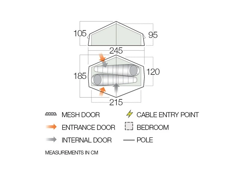 Gepatenteerd Vango TBS® – Tension Band systeem zorgt dat de tent blijft staan bij harde wind. De banden ondersteunen de stokken op 3 plaatsen en voorkomen zijwaartse beweging. Span niet strakker af dan nodig, omdat de stokken anders kromtrekken. Kan bij rustig weer worden opgeborgen.